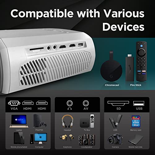 Draagbare multimediaprojector: thuisbioscoopprojector ondersteunt HDMI*2 / USB / VGA / AV / SD-kaart / audio-uitgang 3,5 mm / Bluetooth. Het kan niet alleen draadloos worden aangesloten, maar ook bedraad. De videoprojector is compatibel met iPhone, tv-box, tv-stick, pc’s, laptops, tablets, USB-flashdrive, dvd, PS4, mediaspelers.
